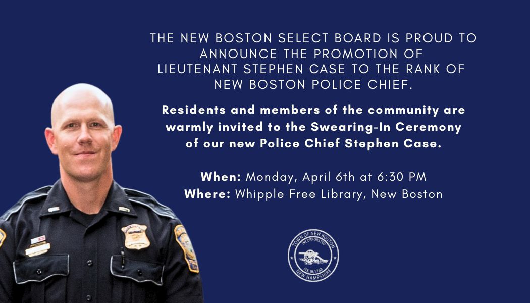 The New Boston Select Board warmly invites all residents and members of the community to join the Town in the Swearing-In Ceremony of New Boston Police Chief Stephen Case.